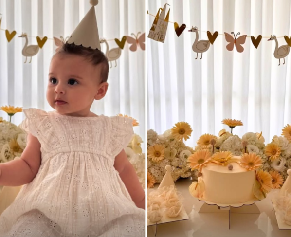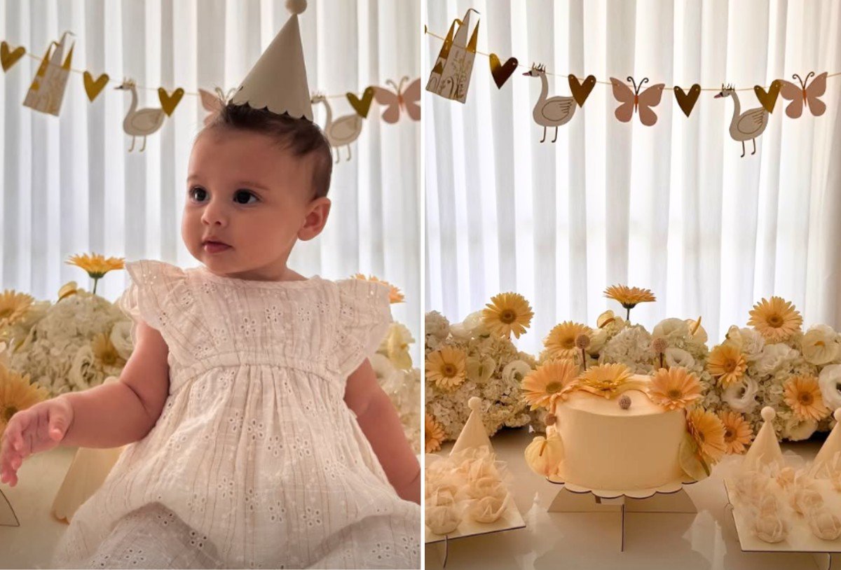 Helena, a caçula do jogador do Santos Futebol Clube, aparece sentada com um chapéu cônico na cabeça. A mãe da criança escolheu um vestidinho de cor clara e tecido de renda para combinar com a decoração. “Amo você, minha vida”, dedicou a modelo, em uma das fotos.